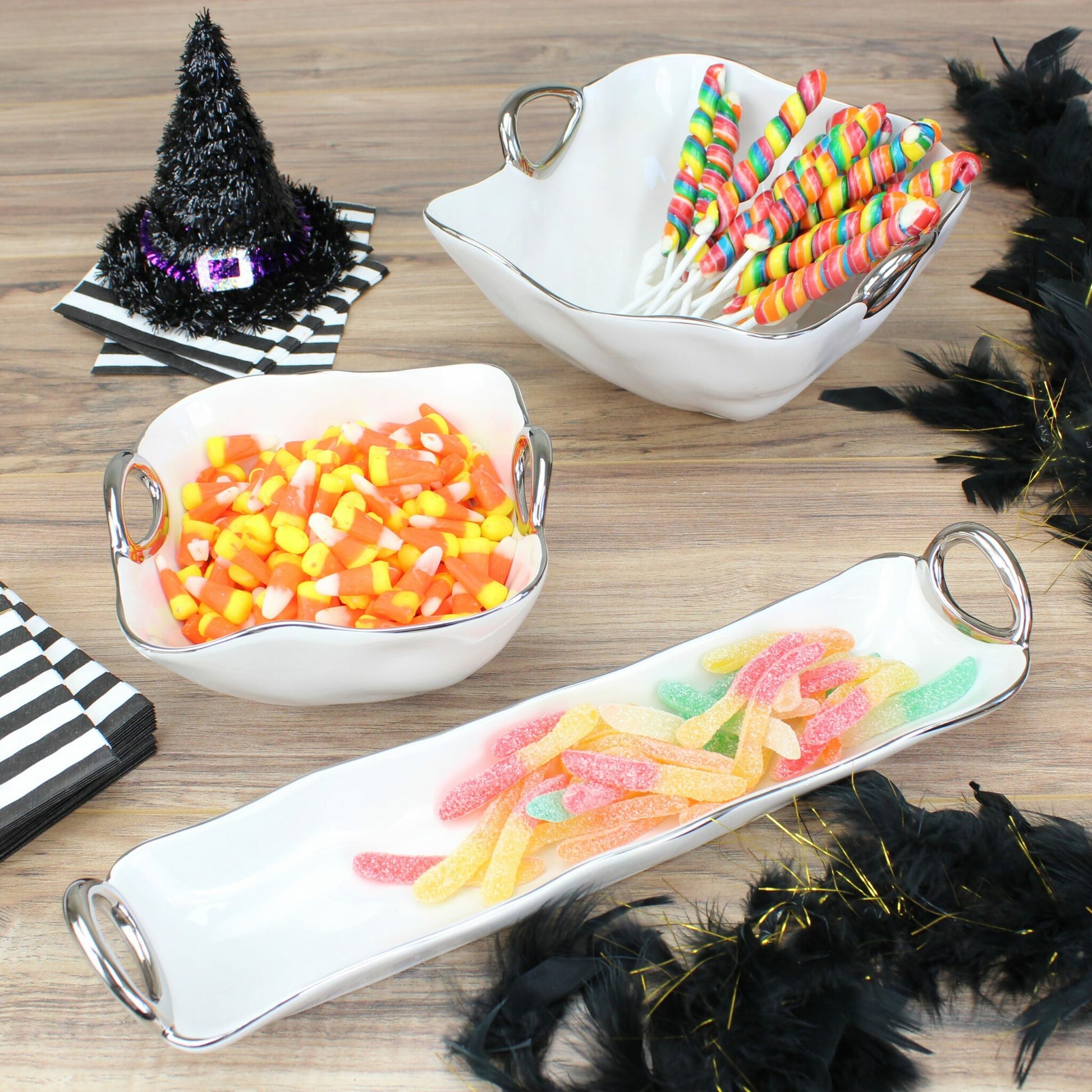 Medium Bowl in Handle with Style. Whatever your serving, from salads to sides, it will look even more appetizing on this beautiful bowl. Stunning white porcelain with smooth and fluent handles in silver titanium. Food safe, dishwasher safe, oven safe to 500°. Easy Care.