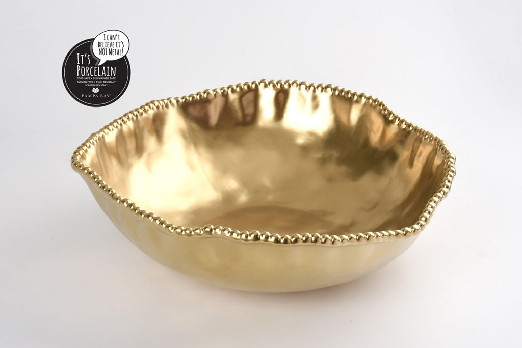 Expertly crafted with a striking gold-tone finish, the Monaco Serving Bowl is not only a beautiful addition to your tableware collection, but also highly functional. Made of durable porcelain, it is resistant to stains and scratches, and can easily be cleaned in the dishwasher. Elevate your dining experience with this elegant serving bowl.