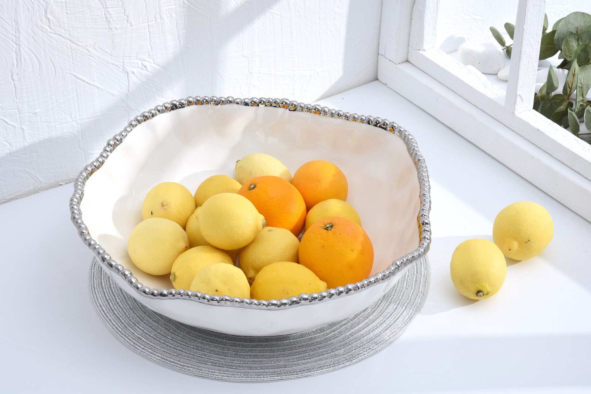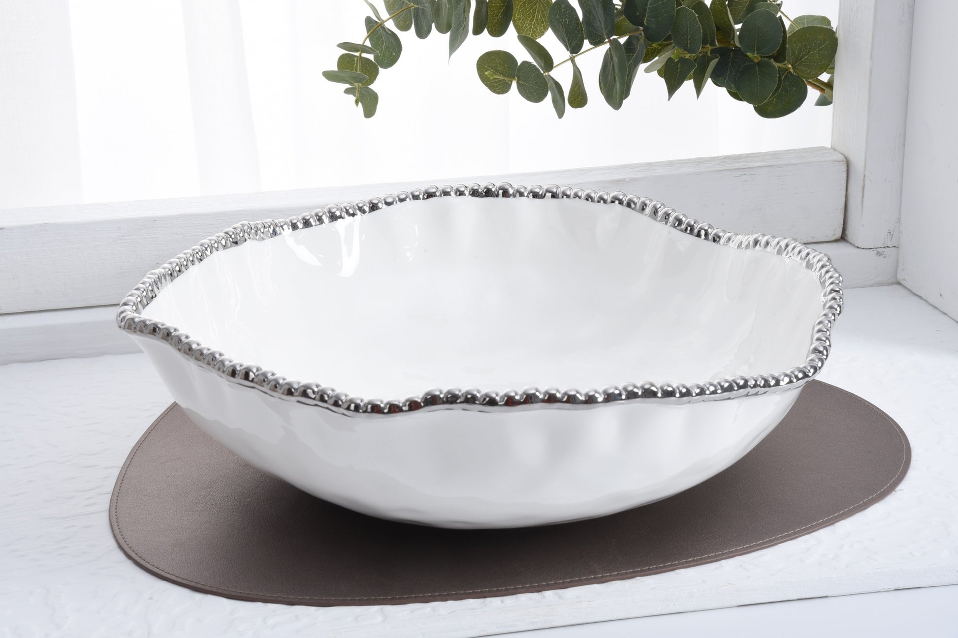Oversized serving bowl in Salerno. Perfect for your next dinner party or holiday! Roasted potatoes and veggies, spaghetti and meatballs or a simple salad serve up nicely in this beautifully crafted bowl. Gleaming white porcelain with lustrous silver beads in titanium finished high-fired porcelain. Food safe. Dishwasher safe. Oven safe to 500°. Easy Care.