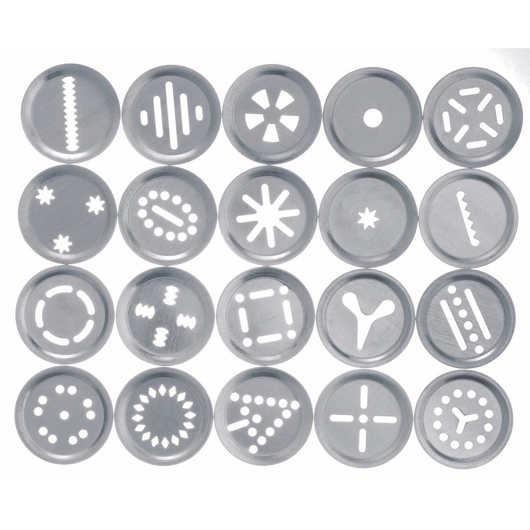 For unlimited baking fun! Press directly onto a baking sheet. Comes with 20 aluminum design templates and 4 plastic nozzles.
