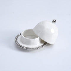 Expertly crafted from white porcelain, this stylish Round Butter Dish features a beautiful silver beaded trim. Designed with durability in mind, it is stain and scratch resistant, making it a long-lasting addition to your kitchen. Plus, its dishwasher safe for easy cleaning.