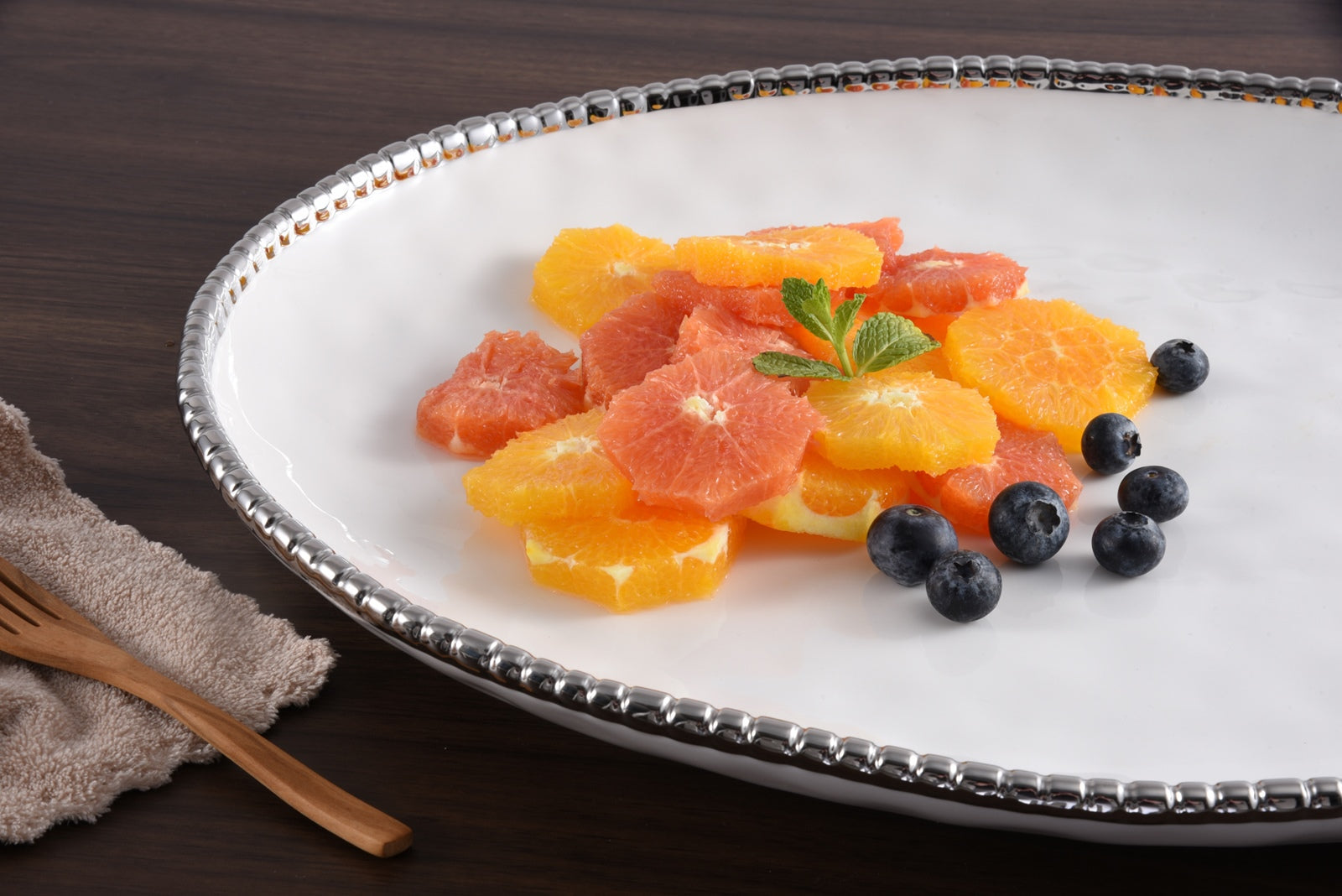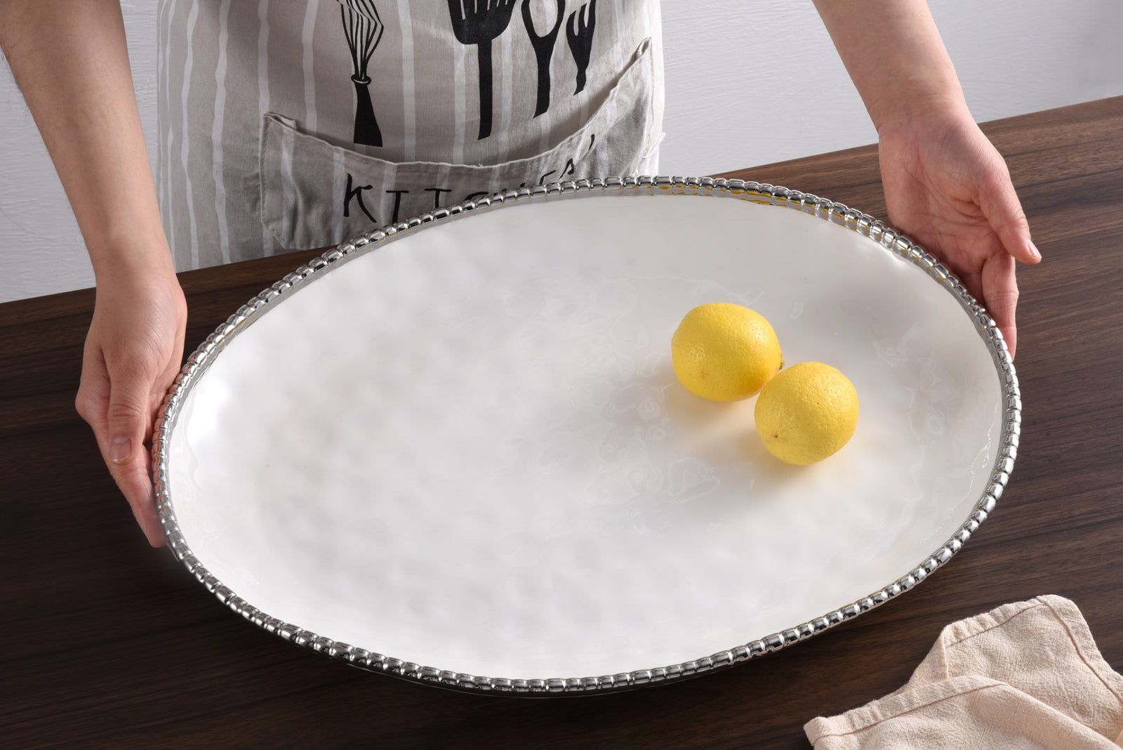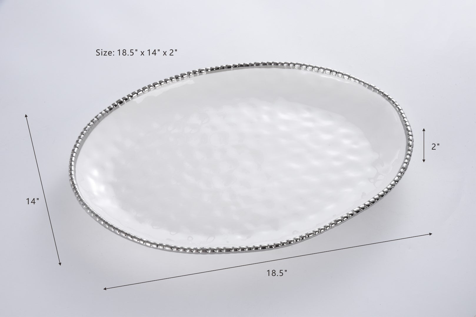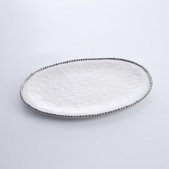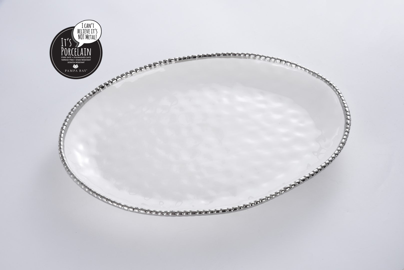 The Salerno Large Oval Platter is a must-have for any elegant dinner party. Crafted from white porcelain, it features delicate silver beading around the rim for a touch of sophistication. Not only is it scratch resistant, but it is also dishwasher safe for easy clean up. Elevate your dining experience with this stunning platter.