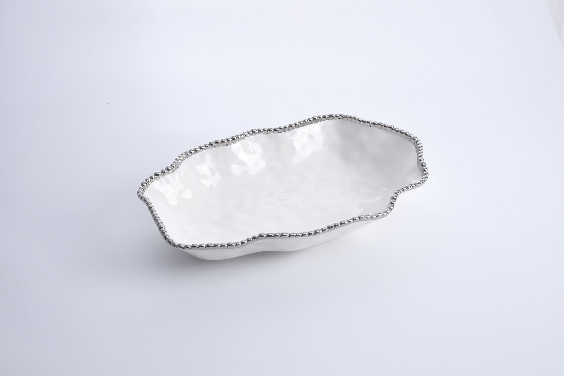Oversized Serving Piece in Salerno. Designed with the thought of friends and family coming together enjoying good food. Great for pastas and paella. High-fired white porcelain with lustrous silver beads in titanium. Food safe, dishwasher safe, oven safe to 500°. Easy Care.