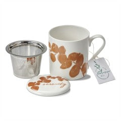 Sip on your favorite tea blends and discover your new favorite mug with our infusing mug. This piece is inspired by simple beauty with a decal design and glossy finish. Made from bone china, this piece features a stainless steel tea infuser and lid.
