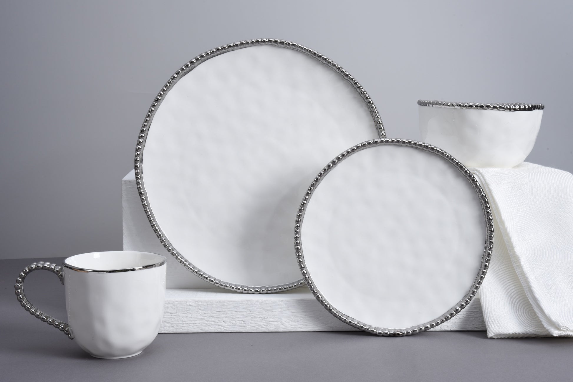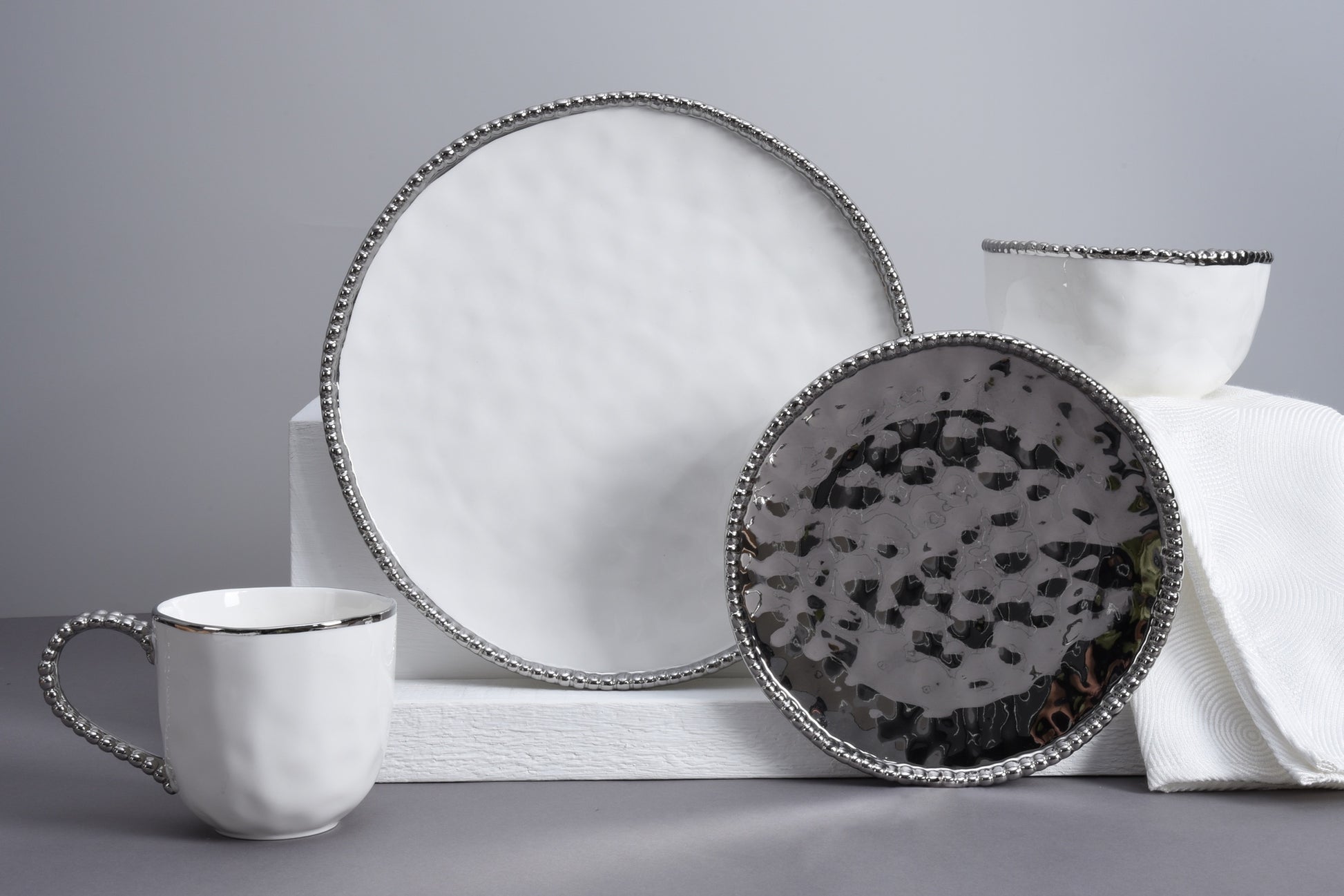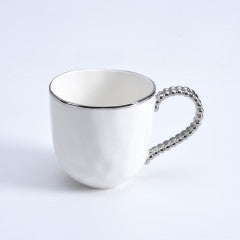 Transform your dining experience with our Set the Table Mug. This elegant white porcelain mug features a smooth silver toned rim and a beaded handle, adding a touch of sophistication to any table setting. Its stain and scratch resistant material ensures long-lasting use, and it's dishwasher safe for easy cleaning. Elevate your meals with this timeless and durable mug.