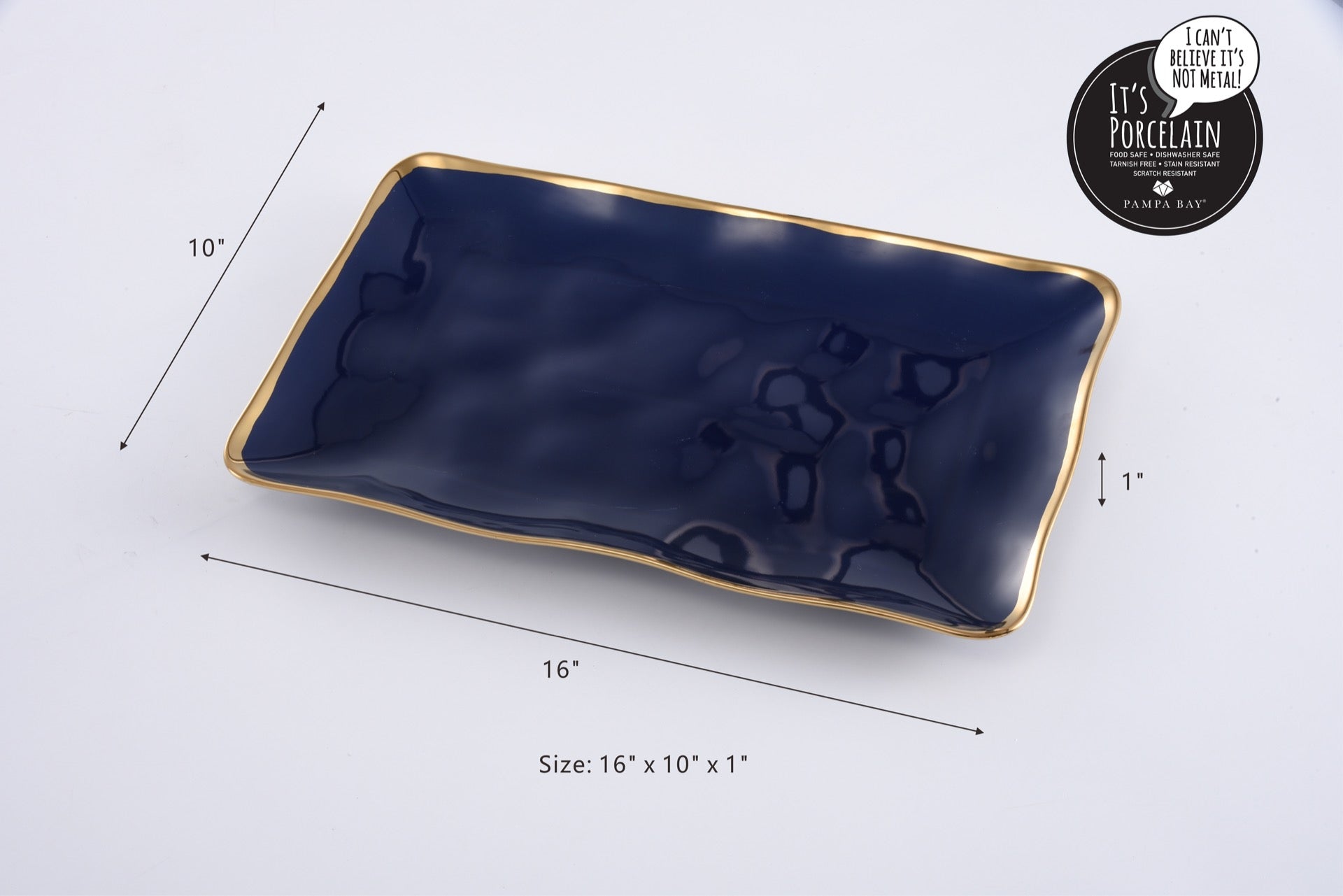 Increase the elegance of your table setting with Sunset by the Sea's rectangular platter. Made with durable porcelain and featuring a deep blue color accented by a gold rim, this platter not only adds a touch of sophistication but also resists scratches and is dishwasher safe for easy cleanup. Elevate your dining experience with this exquisite piece.