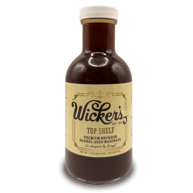 Aged no less than 101 days in fine oak bourbon barrels, Wicker’s Top Shelf enhances our original marinade with the aromatic essence of America’s distilled “native spirit.” To unleash the maximum enjoyment of the meticulously hand-finished Top Shelf flavor, we recommend marinating your selected white meat overnight. As a baste, apply frequently.